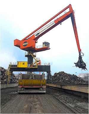 A crane with grapple loads trucks and railcars with scrap for delivery to a designated location within the steel plant.